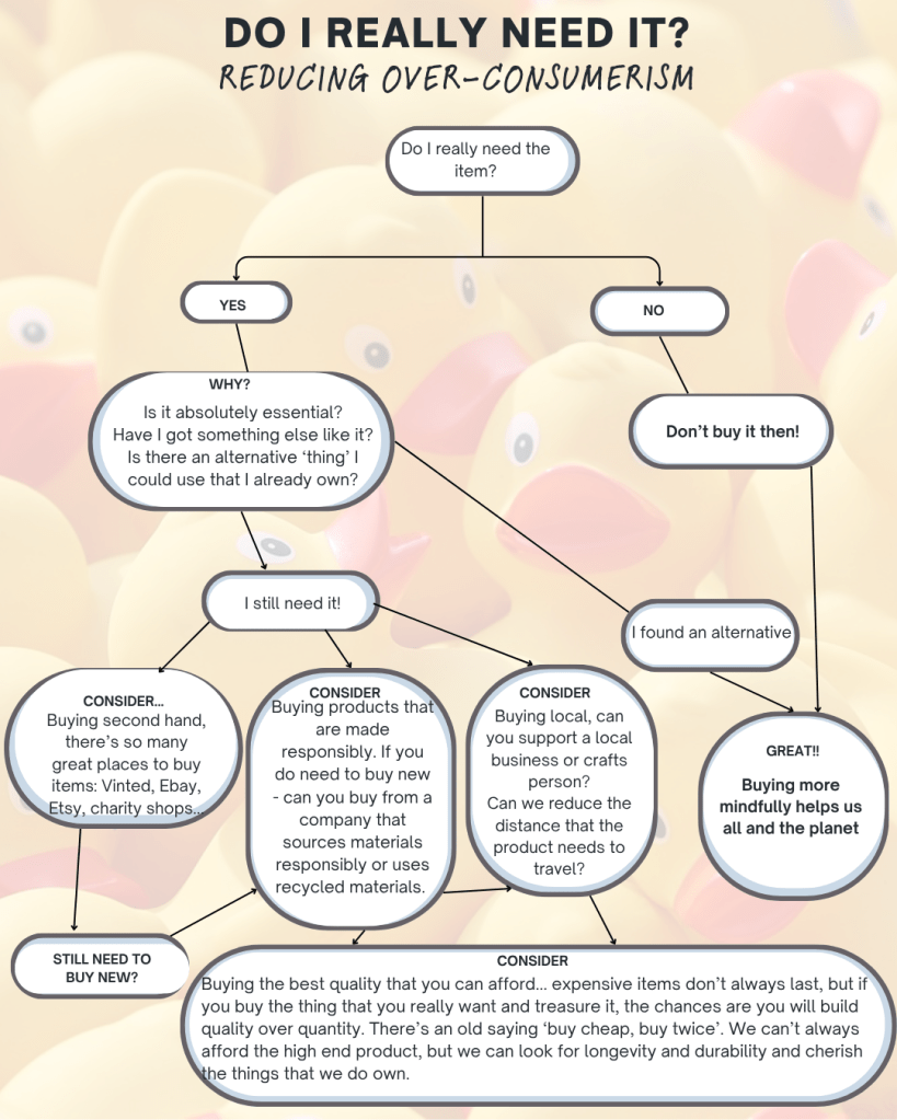 We are bombarded with novelty everywhere we go, it’s a cheap thrill. That cute rubber duck to sit on the side of the bath. A hit of endorphins that soon wears off. I’m trying to wake myself up to consumerism and ask myself if I really need something before I buy it. I wonder if there should be higher taxes on what materials are used for, novelty being the highest? It’s not just about plastic production; it’s about using all our resources mindfully.
