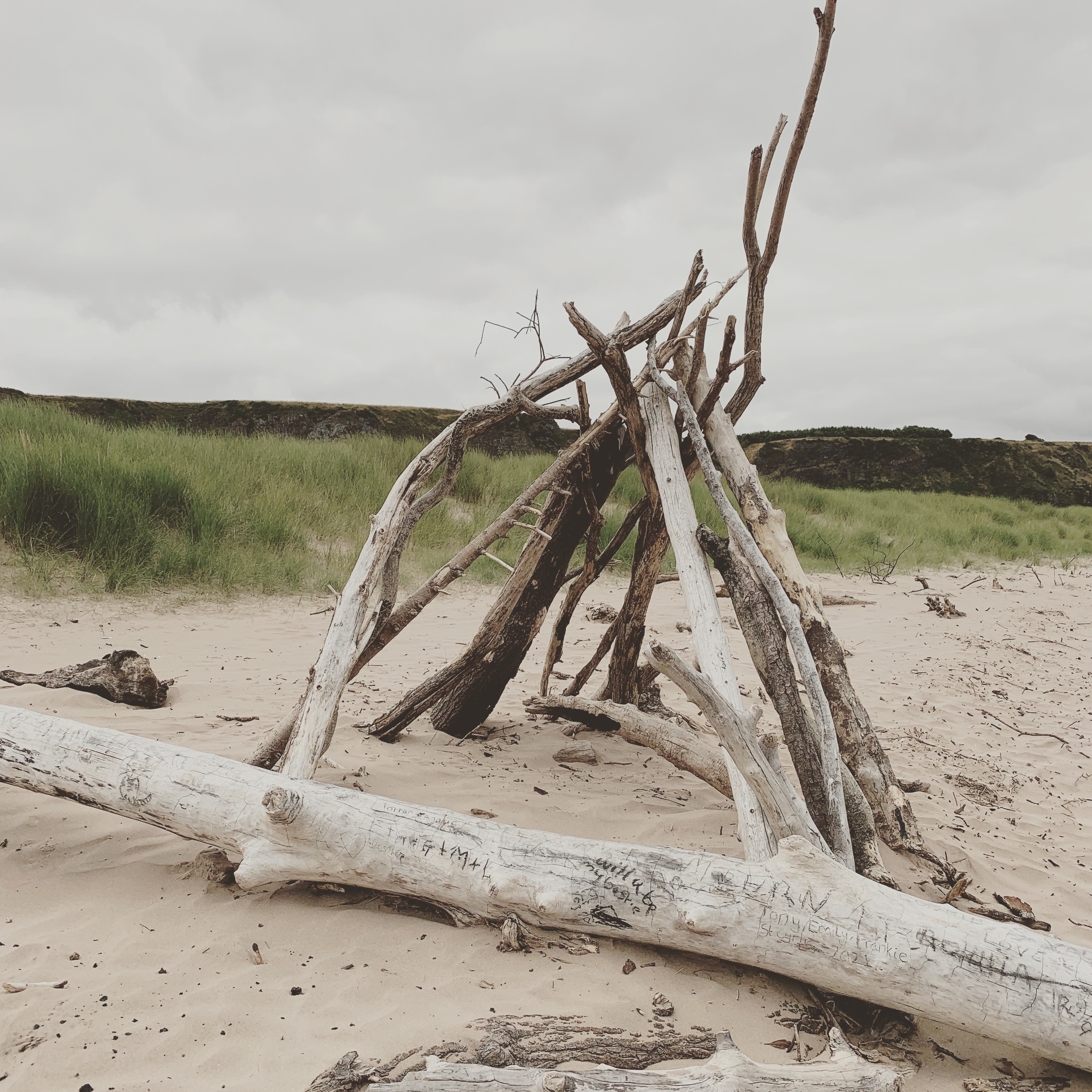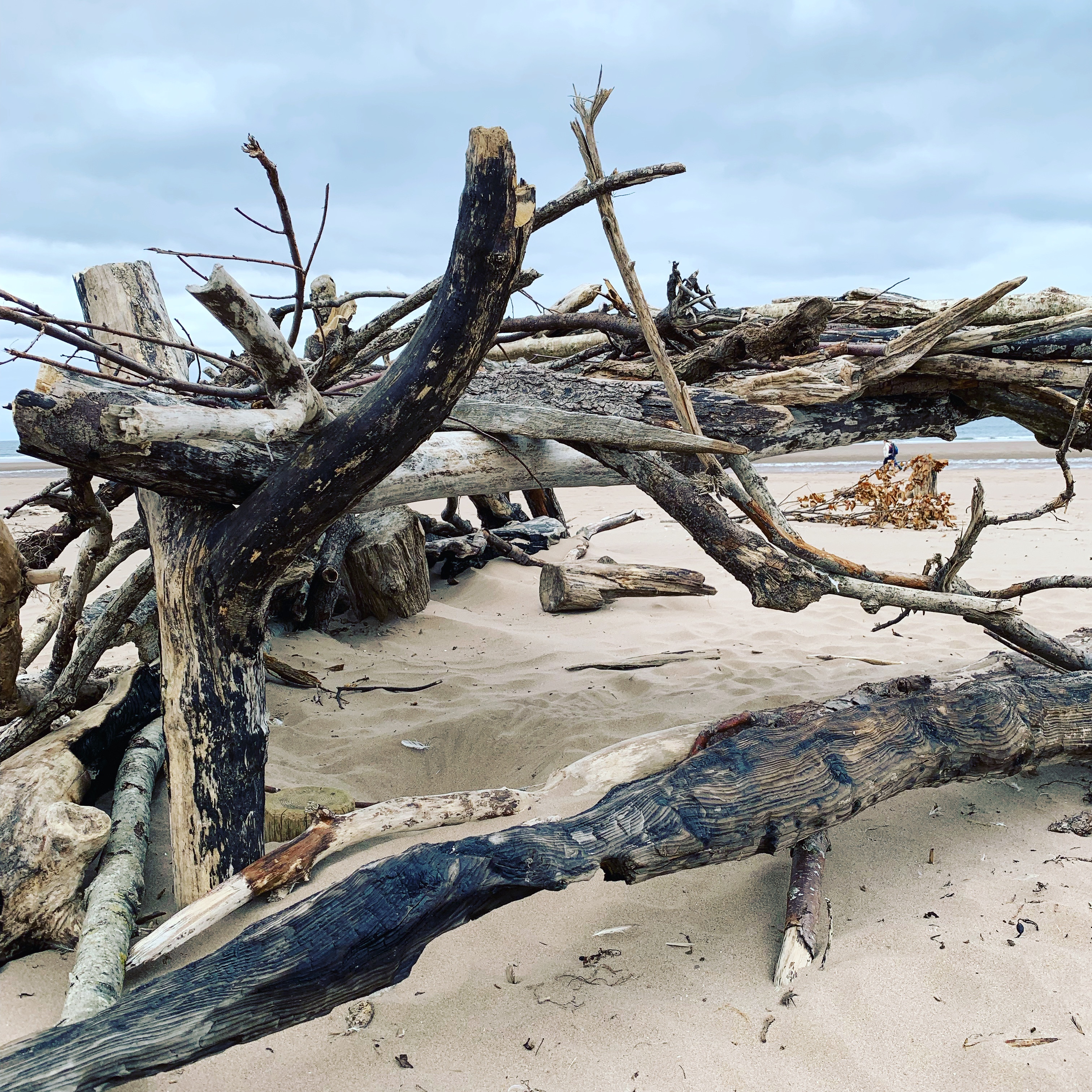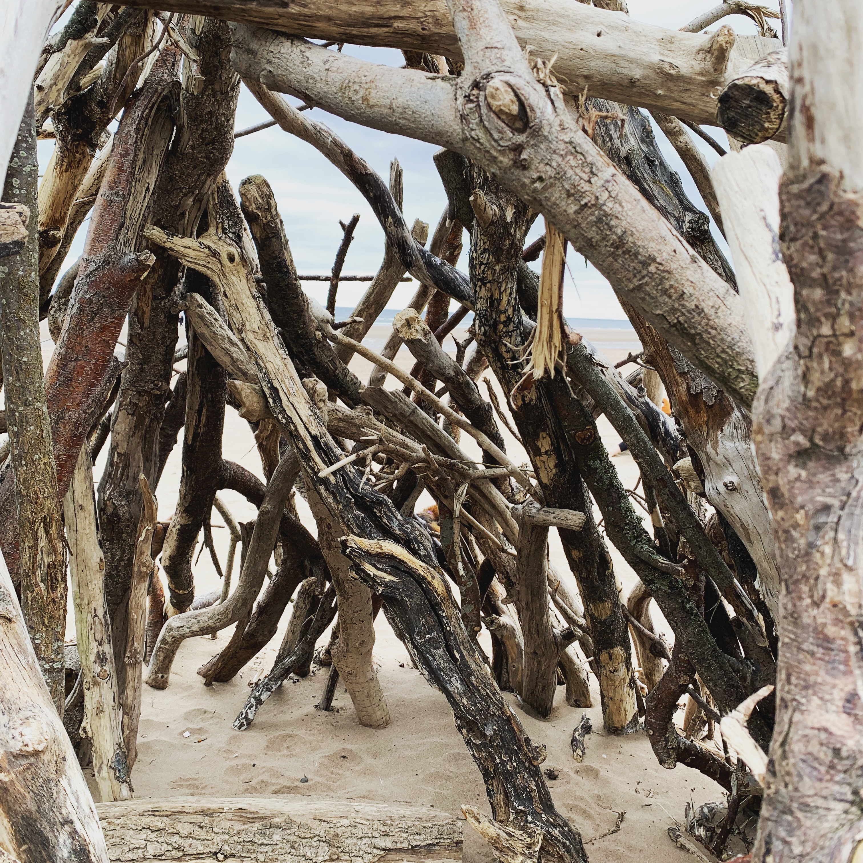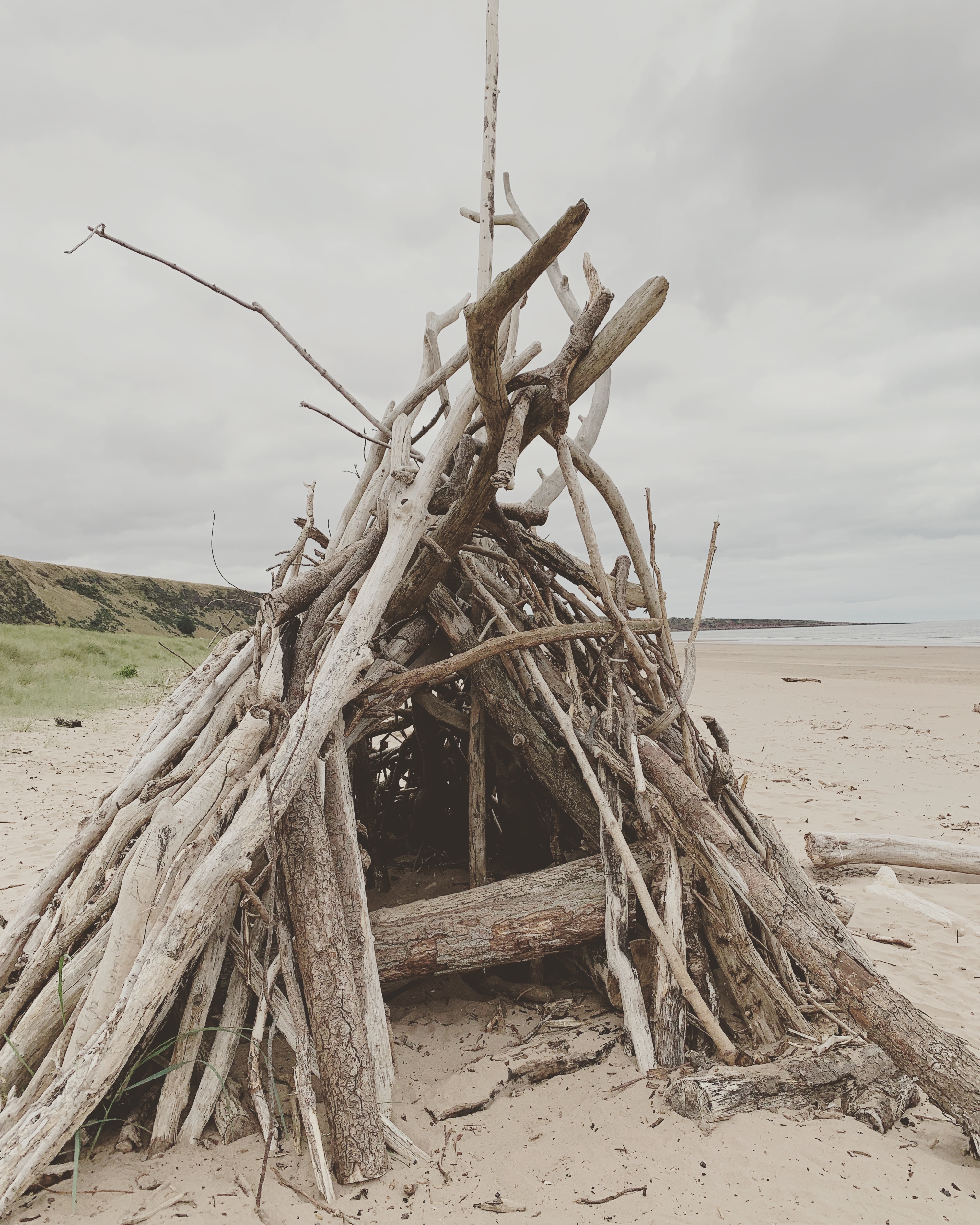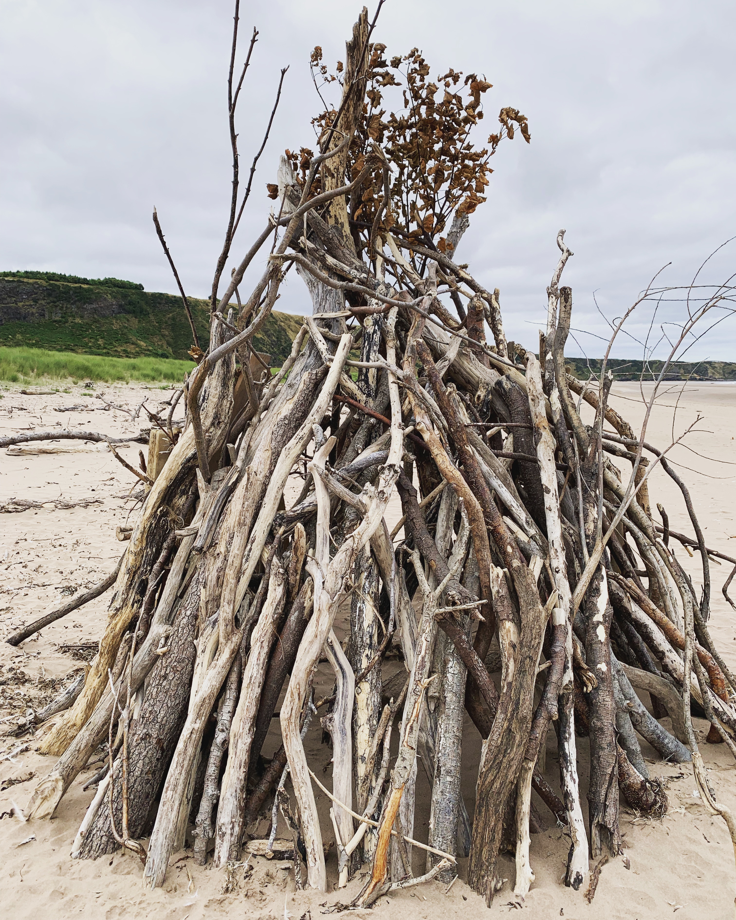 The whole bay was stunning, there was hardly another person for miles. A few tiny bothies were visible set back in the dunes. Someone had used driftwood to create some fabulous shelters, some of the wood was so weathered it looked like rivulets of water in the sand.
