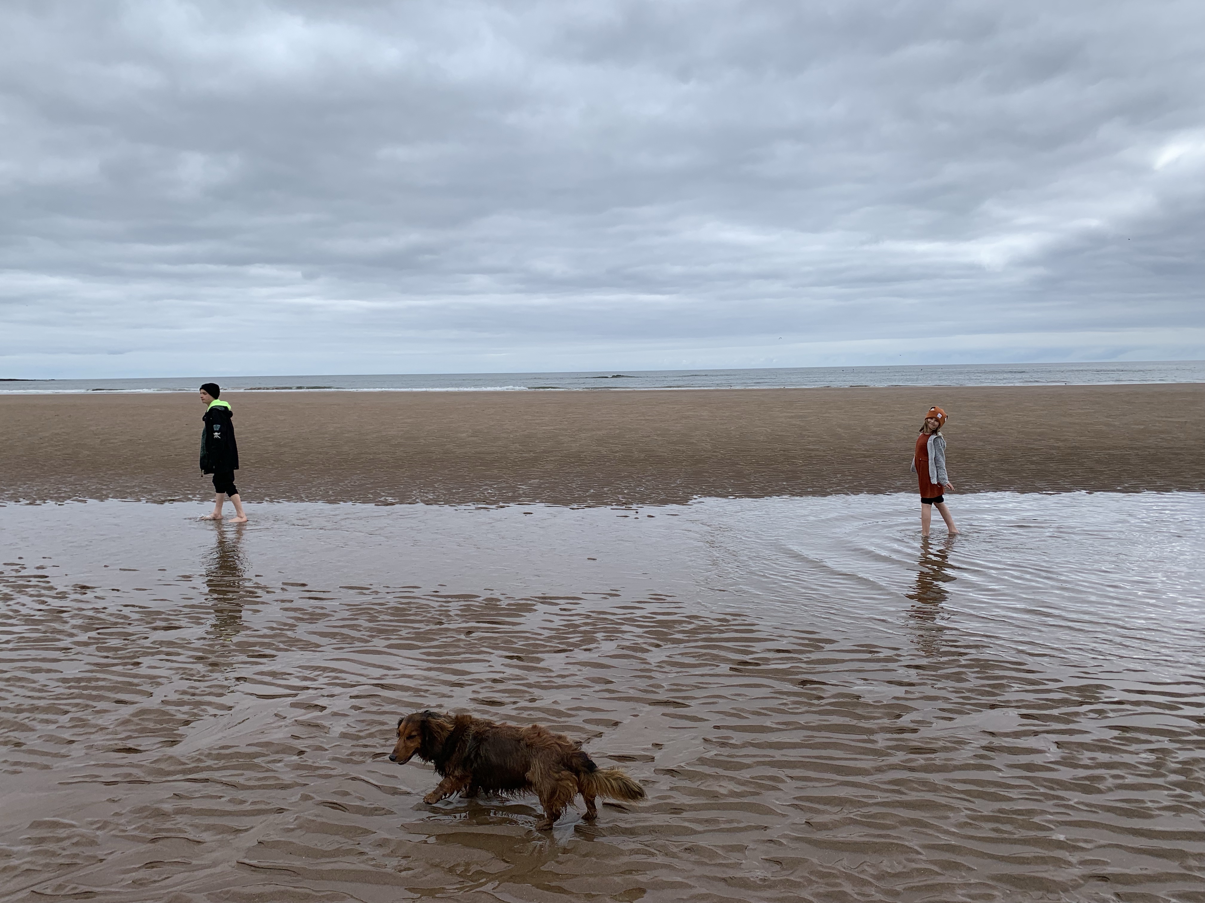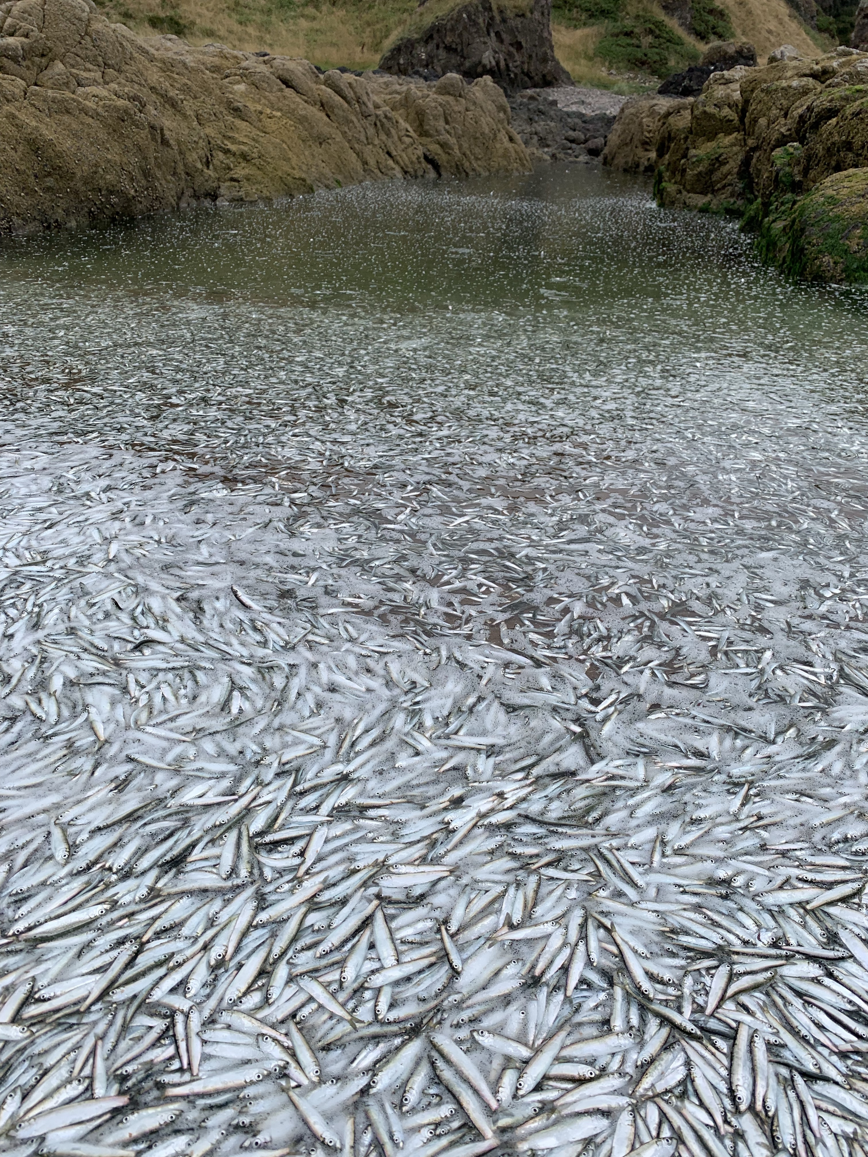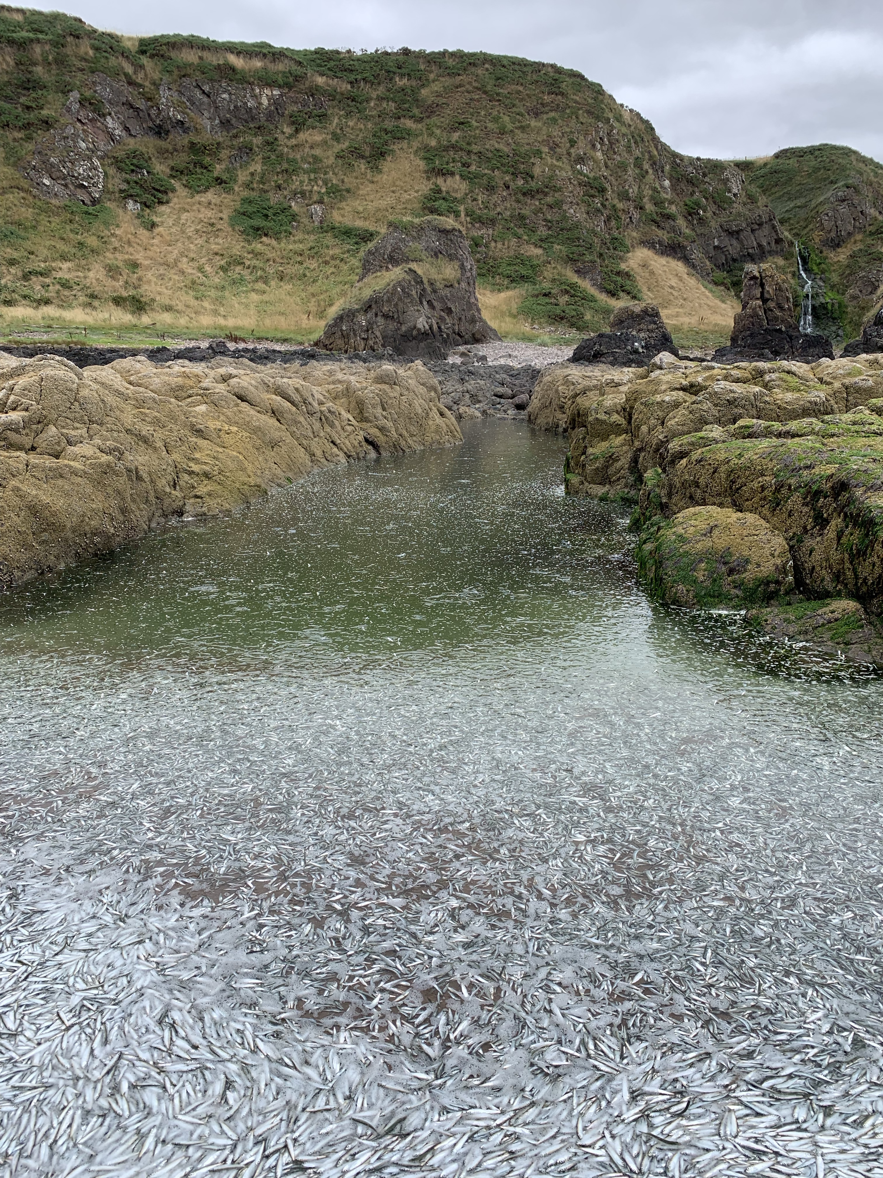We walked for a mile along the beach and found an inlet of rocks and granite stone. In one of the inlets thousands and thousands of sprats had been trapped by the tide. Maybe chased in by birds? The whole pool was glittering with fish as they jumped to get air. Another young group of walkers was trying to dig them a trench to reach the sea. It was an eery sight as the pool glittered and fizzed with fish, many that hadn’t made it lined the edges of the shore line.